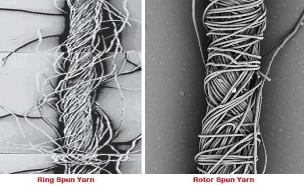 Существует много различий между кольцевым веретеном и кружковым прядением. Ротационная ткань имеет лучшую износостойкость, а ткань из кольцевой веревки имеет немного более высокую прочность цвета, в то время как ткань из кольцевой веревки и кружковой пряжи имеет одинаковую скорость усадки. Двумя важными различиями являются вязкость волокон и степень их переноса.